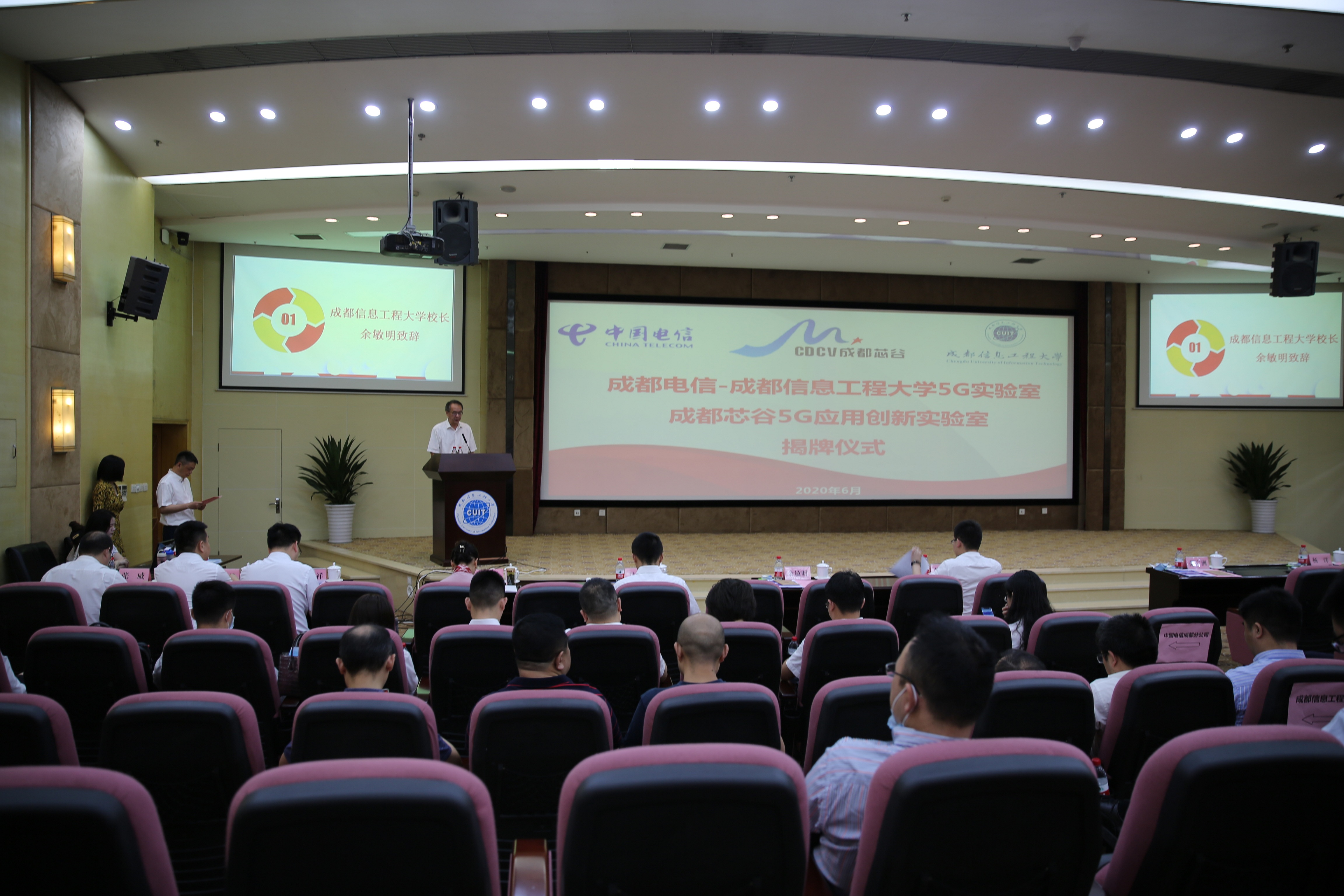 【本网讯】6月9日,西部首个校企地5G实验室——成都电信-成都信息工程大学5G实验室、成都芯谷5G应用创新实验室揭牌仪式在学校航空港校区国际会议厅举行。学校副校长范广洲主持仪式。