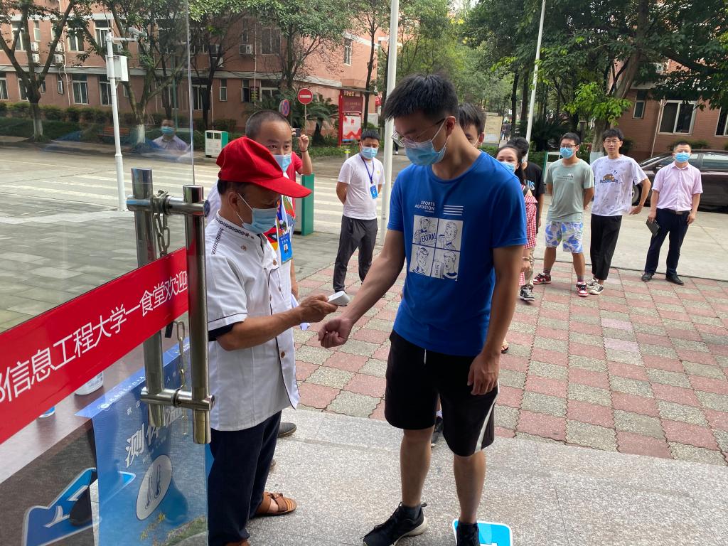 在食堂入口处,学生间隔一米排队,经过体温检测进入食堂;餐厅打饭过程中,学生也保持安全距离,在食堂就餐的学生,取餐后同向就餐,就餐结束依次从另一侧安全出口离开餐厅。为减少人员集聚带来的疫情防控风险,学校鼓励大家自备餐盒,打饭后自行回寝室就餐。