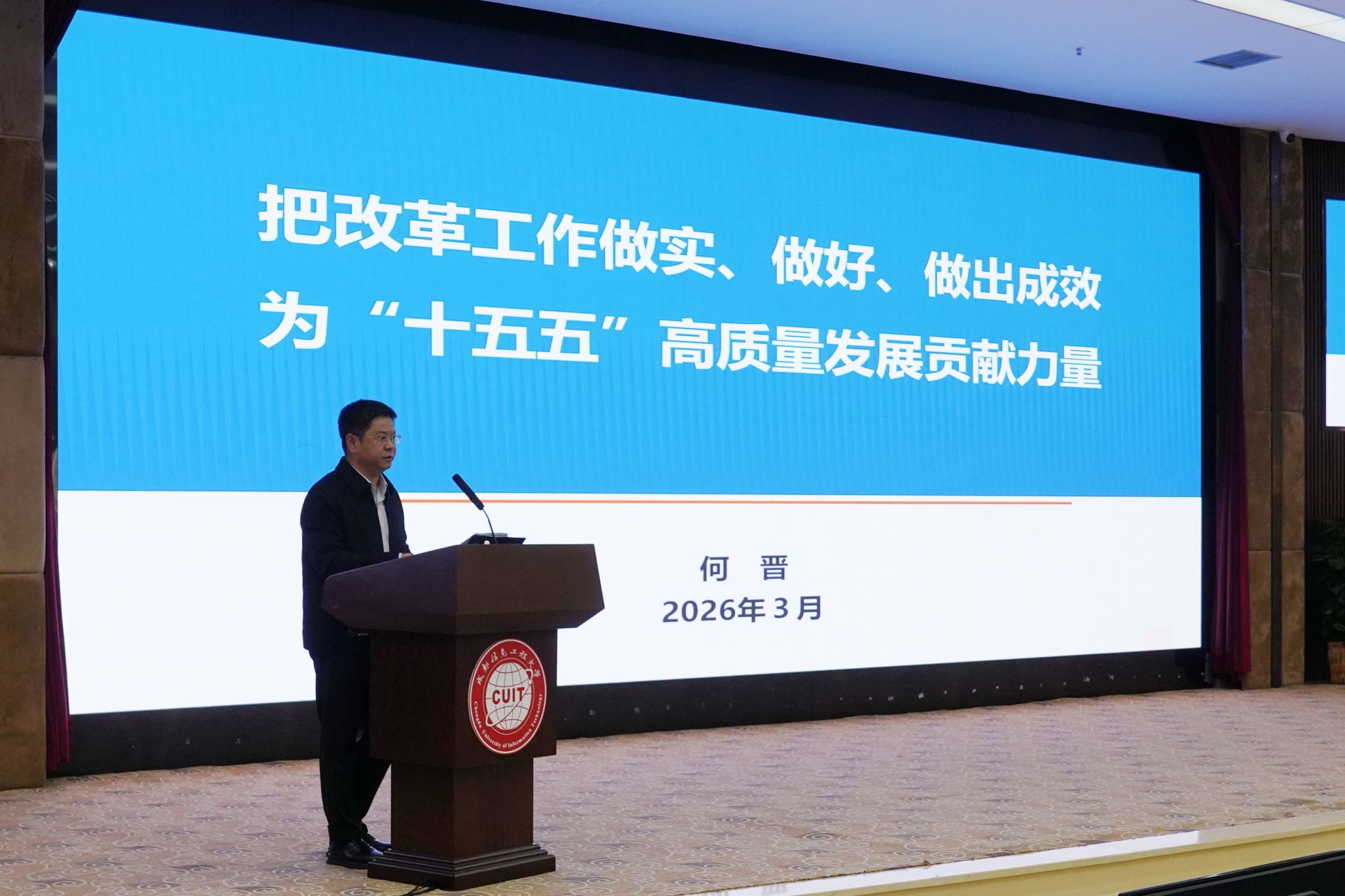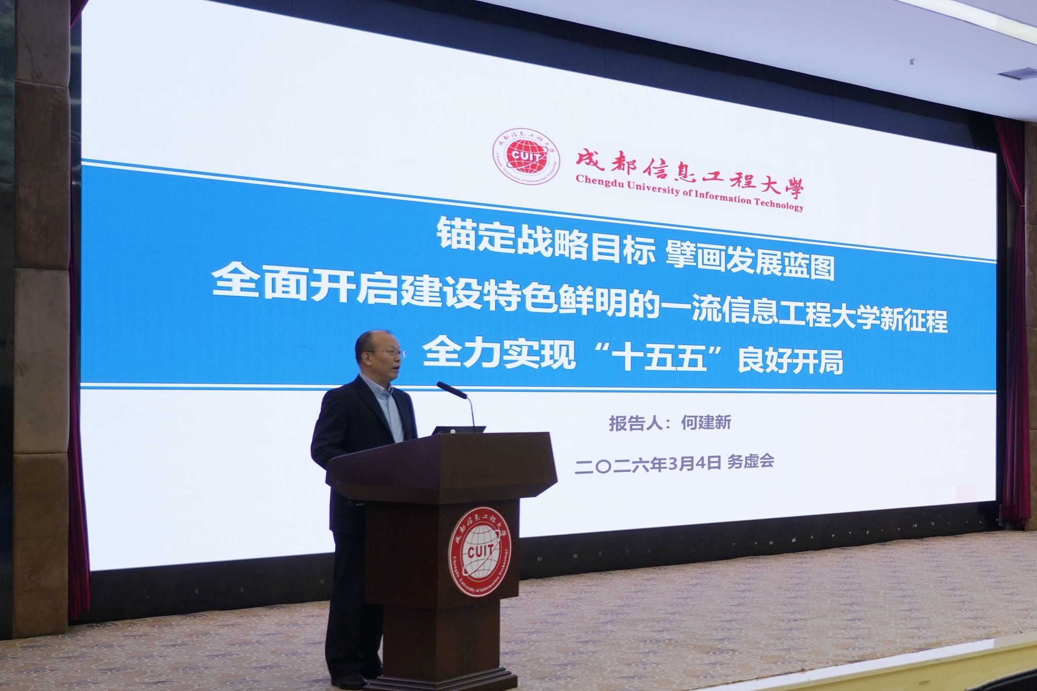 校长何建新作《锚定战略目标、擘画发展蓝图,全面开启建设特色鲜明的一流信息工程大学新征程,全力实现“十五五”良好开局》专题报告。他强调全校上下要锚定学校第二次党代会擘画的“全面建成特色鲜明的一流信息工程大学”目标愿景,统一思想、狠抓落实,把“三步走”战略构想、四大强校之路和“九大工程”落到实处。他客观分析我校发展现状及与对标竞进高校的差距,厘清学校在学科建设、人才培养、科研创新、师资队伍、国际化等方面的不足,并结合“十五五”事业发展规划明确改进目标。他强调学校总体规划及十三个专项规划要围绕“特色”和“一流”,进一步细化可操作、可考核、能落地的工作举措,有效衔接2026年重点工作。他要求各部门要振奋精神、实干担当,为实现“十五五”良好开局作出更大贡献。