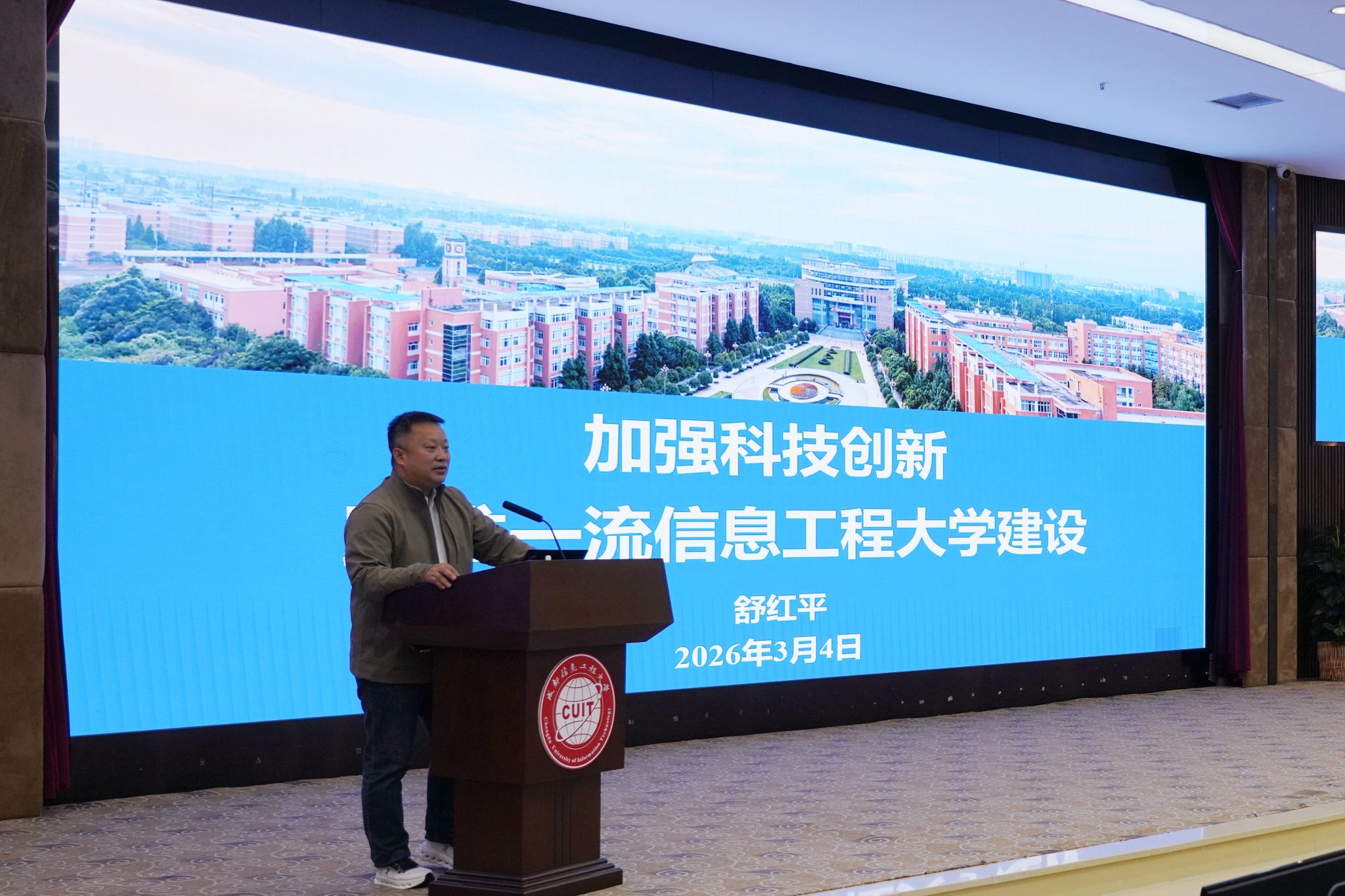 副校长舒红平以《加强科技创新,助推一流信息工程大学建设》为题作报告。他通过调研分析、对标一流高校指出我校科学研究方面存在的差距。并进一步剖析标杆院校的发展路径,明确学校发展及努力方向。他指出要立足学校核心优势,推进气象、信息和统计交叉融合,通过构建有组织科研体系、打造科技创新生态、培育“国防+”新发展动能,打造差异化、不可替代的核心竞争力。他聚焦2026年的核心目标,从平台建设、项目攻坚、成果转化等方面安排部署了科研工作年度关键任务。