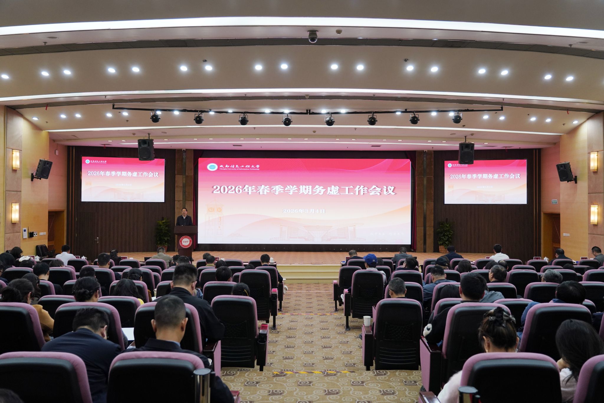 3月4日,学校2026年春季学期务虚工作会在航空港校区国际会议厅召开。会议围绕加快推进特色鲜明一流信息工程大学建设目标,全面贯彻落实学校第二次党代会精神,科学谋划“十五五”规划,进一步研究部署学校2026年重点工作,务虚谋实、凝心聚力,全力推进各项工作开好局、起好步。会议由学校党委书记沈火明主持,全体校领导、副处级以上中层干部参加会议。