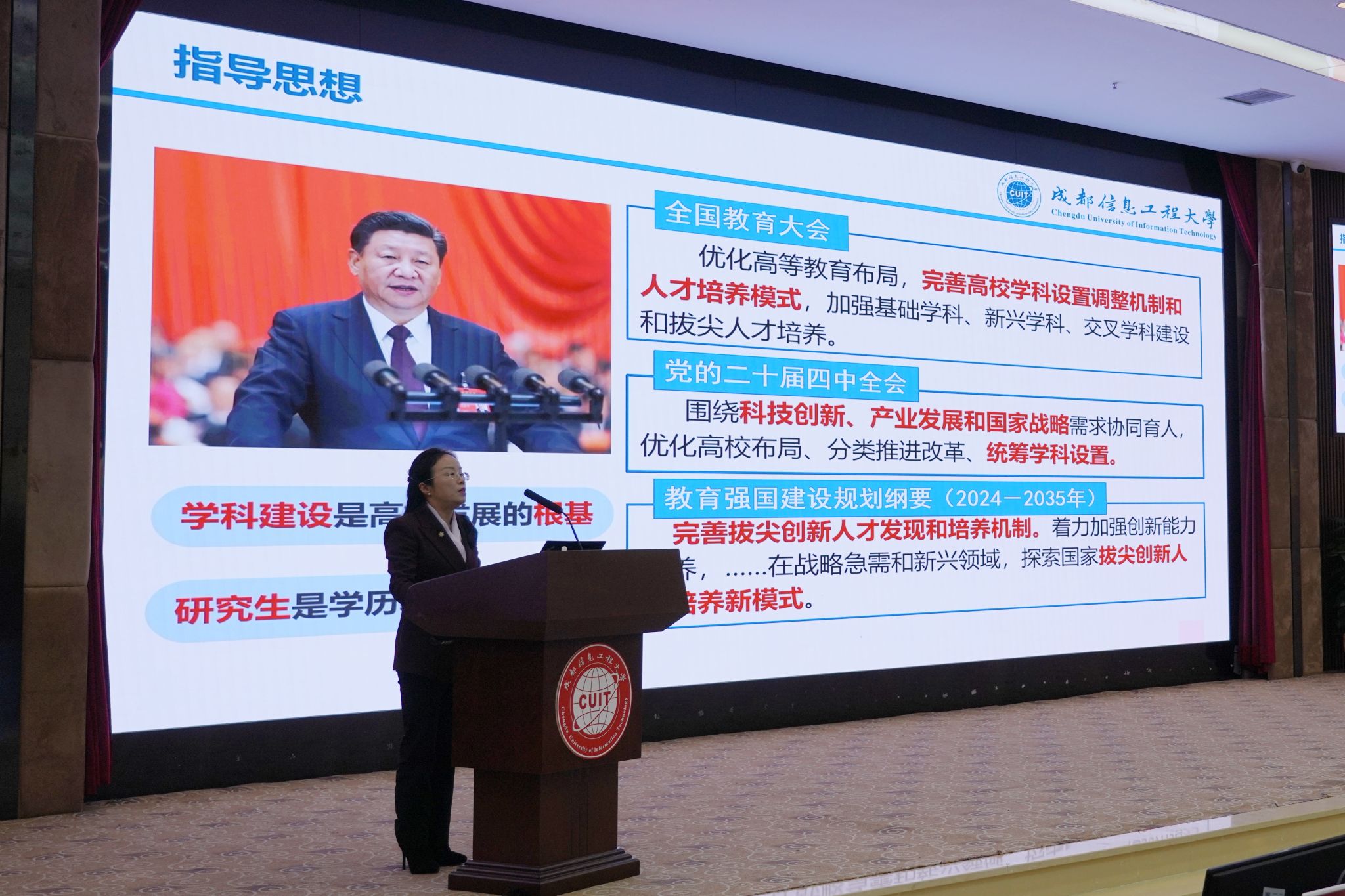 副校长罗小蓉作《“十五五”规划为引领,以新一轮学位点申报为契机,全面开启高质量学科建设和研究生教育新局面》专题报告。她指出学校将以新增学位点和“双一流”建设为引领,调整优化学科专业布局,加强学科交叉融合。她从学科建设和研究生教育的建设目标、建设举措等方面报告了“十五五”规划及2026年工作重点,并就新一轮的学位点申报、卓越工程师学院建设等进行了部署安排。