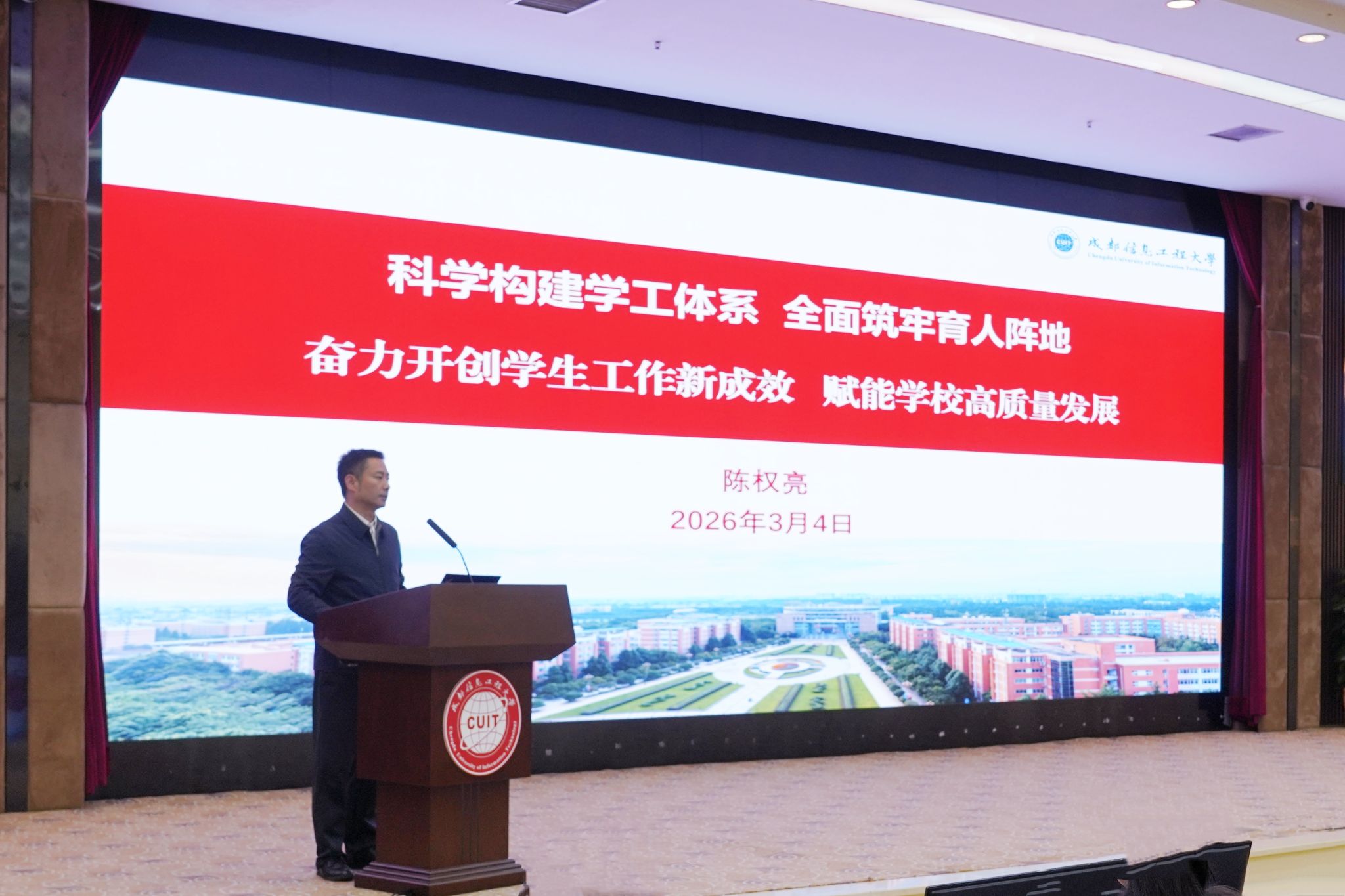 副校长陈权亮以《科学构建学工体系,全面筑牢育人阵地:奋力开创学生工作新成效,赋能学校高质量发展》为题作报告。他回顾了学校学生工作“十四五”期间所取得的工作成效,分析了学生工作存在不足及面临形势,提出全面构建新时代学生工作体系的目标,并实施思政引领、队伍建设、学风建设等九大举措,切实培养“四维三型”高质量人才。他指出,2026年学校将持续推进学风提升、二课堂提质、辅导员学院建设等七项工程,奋力开创学生工作新局面。